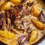 - Rest and Serve: Remove the pork from the oven and let it rest in the braising liquid for 30 minutes. Squeeze the softened garlic cloves out of their husks into the broth or directly over the pork. Adjust seasoning in the braising liquid with salt and pepper to taste. Serve the pork slices spooned with the braising juices, apples, and onions for a comforting and flavorful meal.