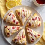 These bakery-style strawberry lemon cream scones feature bright lemon zest in the dough, fresh strawberries folded throughout, and a sweet lemon glaze drizzled on top. Tender and moist from cream and sour cream, they offer a perfect balance of tangy citrus and sweet berry flavors, ideal for a weekend breakfast or afternoon tea.