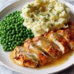 The image shows a white plate on a white marbled surface, holding three main food parts. On one side, there is a round pile of bright green peas with a smooth, firm texture. Next to the peas is a double layer of creamy mashed potatoes covered with a light beige gravy, sprinkled with small green herbs on top. In front of the mashed potatoes, there are two thick pieces of golden-brown grilled chicken breast with a slightly crispy skin, also topped with some gravy that pools gently on the plate. The colors are warm and natural, with a fresh look. Photo taken with an iphone --ar 4:5 --v 7