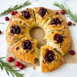 Keywords: Brie cheese wreath, cranberry sauce appetizer, holiday appetizer, puff pastry wreath, Christmas appetizer, festive cheese recipe