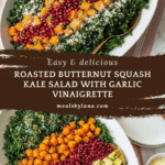 Keywords: butternut squash salad, kale salad, roasted garlic vinaigrette, pumpkin seeds, pomegranate, healthy salad, fall salad, vegetarian salad