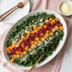A vibrant and nutritious salad featuring roasted butternut squash and garlic, tender Tuscan kale massaged with a zesty roasted garlic vinaigrette, crowned with crunchy toasted pumpkin seeds, sweet pomegranate arils, and a sprinkle of Parmesan cheese. Perfect as a satisfying side or light main, this salad blends sweet, savory, and tangy flavors with varied textures.