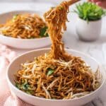 This Cantonese Chow Mein recipe features thin fresh Hong-Kong style egg noodles pan-fried to a crispy golden texture and tossed with a flavorful combination of sautéed onions, green onions, bean sprouts, and a rich sauce made from soy, oyster, and fish sauces. Ready in just 15 minutes, this classic stir-fried noodle dish offers a perfect balance of savory and slightly sweet flavors with a hint of sesame oil finish.