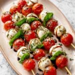 Keywords: Caprese skewers, appetizer, Italian recipe, mozzarella, cherry tomatoes, basil, balsamic glaze, easy skewers