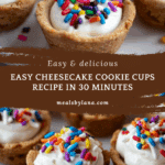 Delicious and easy-to-make Cheesecake Cookie Cups combine the best of two treats: soft, warm chocolate chip cookie cups filled with a creamy vanilla cheesecake filling. Perfect for parties or a sweet snack, these mini desserts are baked in a muffin pan and topped with festive sprinkles for a fun and appealing presentation.