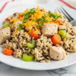A close-up of a creamy rice dish served on a white plate, featuring mixed rice with visible grains of white and wild rice, interspersed with small chunks of cooked chicken. The dish includes diced orange carrots, green celery pieces, and is topped with a sprinkle of shredded orange cheese and bright green fresh herbs. The texture looks soft and moist, with the ingredients evenly mixed. A fork rests on the edge of the plate, and there is a white marbled surface underneath with a red and white striped fabric in the background. photo taken with an iphone --ar 4:5 --v 7