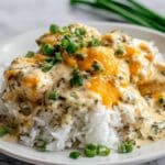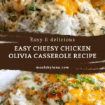 Chicken Olivia is a creamy, cheesy baked casserole featuring shredded rotisserie chicken mixed with sour cream, cream of chicken soup, black olives, green chilies, and sharp cheddar cheese. This comforting dish is baked until bubbly and served over rice, making it a perfect easy weeknight meal for the whole family.