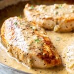 - Cook Chicken: Add the chicken breasts to the skillet and cook for about 5 minutes on each side until nicely browned. Pour in 1/2 cup of chicken broth, cover the skillet, and let the chicken cook for an additional 5 to 6 minutes until cooked through. Remove the chicken from the skillet and set aside.