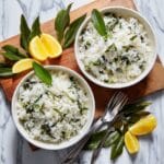 Two white bowls filled with cooked white rice mixed with small pieces of green herbs are placed side by side. Each bowl is topped with a small green leaf and a yellow lemon wedge, sitting on the left side of the rice. The bowls rest on a wooden board with scattered green leaves and three lemon wedges nearby. A shiny silver fork lies between the two bowls on the right, all set on a white marbled surface. Photo taken with an iphone --ar 4:5 --v 7