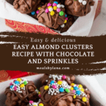 Delicious and easy-to-make almond clusters featuring semi-sweet chocolate and toasted almonds, enhanced with vanilla and a touch of salt. These no-bake treats are perfect for snacking or gifting and can be customized with colorful sprinkles for a festive touch.