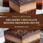 Decadent Chocolate Mousse Brownies featuring a rich, fudgy brownie base topped with a luscious chocolate mousse and finished with a glossy chocolate ganache. Perfect for chocolate lovers seeking an indulgent dessert with layers of chocolatey goodness.