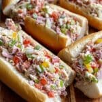 The Chopped Italian Sandwich is a fresh, flavorful twist on the classic Italian sub, made by finely chopping a medley of deli meats, provolone cheese, fresh vegetables, and banana peppers, then tossing them in a tangy blend of mayonnaise, red wine vinegar, Italian dressing, and seasoning. Served on soft hoagie rolls, this sandwich offers a delightful combination of textures and zesty flavors perfect for lunch or dinner.