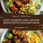 Keywords: Cilantro Lime Chicken Bowls, cilantro lime chicken, chicken bowl recipe, chipotle sauce, Mexican rice bowl, healthy chicken dinner, avocado salsa bowl