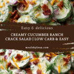 This creamy cucumber ranch crack salad is a quick and easy low carb side perfect for summer. With crisp cucumbers, cheddar cheese, crispy bacon, red onion, and fresh dill, it’s a flavorful dish ready in just 10 minutes. Ideal for barbecues, potlucks, or simple meal prep.
