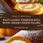This Classic Pumpkin Roll with Creamy Filling is a delightful fall dessert featuring a moist pumpkin-flavored sponge cake rolled with a rich, smooth cream cheese filling. Perfect for holiday gatherings, it combines warm spices and pumpkin puree in a light cake, complemented by a luscious vanilla cream cheese frosting.