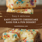 These Confetti Cheesecake Bars combine the best of two treats: rich, creamy cheesecake and fun, colorful cookie dough. Perfectly portioned into bars, they make a delightful dessert for any occasion.