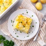 A square piece of cheesy mashed potatoes sits in the center of a white plate, sprinkled with small green parsley leaves and black pepper. The mashed potatoes layer looks creamy and smooth, with melted orange cheese mixed throughout. To the left, a white baking dish shows more mashed potatoes with a golden baked top. The plate rests on a beige striped cloth on a white marbled surface. On the top right, three small yellow potatoes and some parsley leaves add a fresh touch, and a silver fork lies beside the plate. Photo taken with an iphone --ar 4:5 --v 7