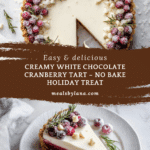 This festive white chocolate cranberry tart is a smooth and creamy no-bake dessert perfect for the holiday season. It features a gluten-free oat and almond crust, a tangy cranberry layer made with fresh cranberries simmered into a jam, and a decadent raw white chocolate filling made from cashews, coconut milk, and vegan white chocolate. The tart is topped with maple syrup and monk fruit sweetener-coated cranberries for a beautiful and delicious finish. This dairy-free, refined sugar-free, and gluten-free tart is ideal for a crowd and requires minimal baking.