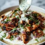 The dish is served in a white bowl filled with a creamy white sauce base that covers the bottom layer. On top of the sauce, finely chopped red onions and fresh green chopped herbs are scattered evenly. The main layer consists of grilled, charred chicken pieces, golden brown with a slightly crispy texture, piled in the center. A thick white sauce with green herbs is being poured over the chicken from above, adding a rich creamy texture that spreads over the meat. The whole dish rests against a white marbled texture background. Photo taken with an iphone --ar 4:5 --v 7