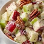 A refreshing Crisp Apple Cranberry Walnut Salad featuring tender chopped apples, toasted walnuts, and dried cranberries tossed in a creamy, spiced dressing made with Neufchatel cheese, sour cream, cinnamon, nutmeg, and brown sugar. This sweet and tangy salad is perfect as a light dessert or a festive side dish, offering a delightful blend of textures and seasonal flavors.