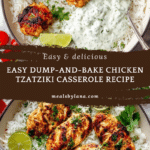 This Dump-and-Bake Chicken Tzatziki with Rice is a simple, flavorful one-dish meal perfect for busy weeknights. Tender chicken and aromatic rice are baked together under a creamy tzatziki layer, creating a comforting dish with Mediterranean flair.