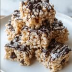 The image shows five square-shaped puffed rice treats stacked on a white plate, each with a light golden-beige color from the puffed rice, and small, round, dark chocolate chips embedded throughout. The top of each treat has a layer of drizzled dark chocolate, with a shiny texture and uneven lines crossing over the puffed rice. Some chocolate chips are partially melted, adding a glossy look. The treats are lightly dusted with white powdered sugar, creating a soft contrast against the chocolate. The plate sits on a white marbled surface, enhancing the clean and simple presentation. photo taken with an iphone --ar 4:5 --v 7