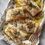 Four pieces of cooked white fish fillets lay on crinkled silver foil, each fillet topped with a golden-brown spice layer and sprinkled with small green herb flakes. The fish fillets have a flaky texture, especially visible where a black metal fork pulls apart one piece in the lower left corner. There are glistening drops of melted butter around the fillets adding shine, and the foil underneath reflects light with a mix of yellows and whites. The whole scene sits on a white marbled texture surface. photo taken with an iphone --ar 4:5 --v 7