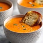 A close-up view of a white bowl filled with smooth, orange tomato soup that appears thick and creamy, with a few small green herbs floating on top. A piece of crusty bread, light golden with a soft, airy texture and some darker toasted edges, is partially dipped into the soup on the right side of the bowl. The bowl has a patterned texture around its outside surface. The scene is set on a white marbled surface with partial views of other similar bowls filled with the same soup in the background, all softly lit. Photo taken with an iphone --ar 4:5 --v 7