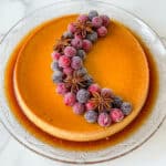 - Unmold and serve: To serve, run a knife around the pan’s edges to release the flan. Place a plate wider than the pan upside down on top and quickly invert. Remove the pan and optionally decorate with cranberries, rosemary, and star anise. Slice and enjoy your festive flan!