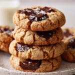 A close-up view of five round cookies stacked loosely on a white plate, each cookie has a golden-brown cracked surface with melted dark chocolate chips visible in the center and sprinkled with coarse white sea salt flakes. The cookies have a slightly rough, crumbly texture with cracks showing the gooey chocolate inside, placed on a white marbled surface with a blurred glass of milk in the background. photo taken with an iphone --ar 4:5 --v 7