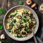 A creamy and flavorful garlic butter orzo recipe with sautéed mushrooms and fresh spinach, cooked in a savory chicken or vegetable stock and finished with parmesan cheese. Perfect as a comforting side dish or a light main course.