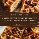 Keywords: holiday stuffing, savory stuffing, garlic butter stuffing, Heavenly Waffles recipe, Thanksgiving side dish, sausage stuffing, baked stuffing