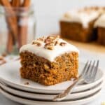 A single square piece of carrot cake sits centered on a stack of three white plates, showing a moist, textured brown crumb with tiny orange flecks from the carrot. On top, there is a thick layer of creamy white frosting sprinkled with small chunks of pecans. A silver fork rests on the plate’s right side with a few cake crumbs scattered nearby. In the background, a glass jar filled with cinnamon sticks is visible to the left, and part of a larger frosted carrot cake is blurred on the right. The surface beneath has a white marbled texture. photo taken with an iphone --ar 4:5 --v 7