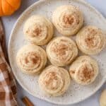 The image shows seven round, light beige cookies on a white speckled plate. Each cookie has a slightly rough, airy texture on the top, with a swirl pattern and a light dusting of brown spice, likely cinnamon. The cookies are arranged in a loose circle, some touching each other, with one partially cut off at the edge of the plate. The plate rests on a white marbled surface, with a small orange pumpkin and a brown and white checkered cloth visible in the background, and two cinnamon sticks placed near the bottom left corner. Photo taken with an iphone --ar 4:5 --v 7