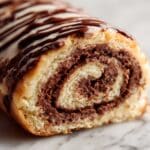 A close-up view of a slice of rolled pastry showing two main layers: a soft, light beige dough with a fluffy texture as the outer layer and a rich, dark brown chocolate filling spiraled thickly inside. The top has a golden-brown crust with a shiny, slightly uneven chocolate drizzle pattern that follows the roll's curve. The image captures the moistness of the chocolate and the airy feel of the dough, set against a white marbled texture. photo taken with an iphone --ar 4:5 --v 7