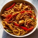 The image shows a bowl filled with stir-fried noodles mixed with pieces of chicken and slices of red and green bell peppers. The noodles are golden brown with a slightly glossy texture from the sauce. Chicken pieces are cooked to a light brown color and scattered evenly throughout. The red bell pepper strips are bright and fresh-looking, placed on top and throughout the noodles. The bowl is white and sits on a white marbled surface, with natural light highlighting the food’s colors and textures. photo taken with an iphone --ar 4:5 --v 7