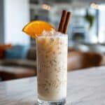 A tall clear glass sits on a white marbled surface, filled with a creamy beige drink that has visible small brown specks and large clear ice cubes floating inside. Near the top, the drink has a smooth texture mixed with some lighter frothy areas. Garnished on the rim are two brown cinnamon sticks standing upright and a bright orange slice curved slightly around the edge. The background shows a blurred kitchen setting with soft natural light. photo taken with an iphone --ar 4:5 --v 7