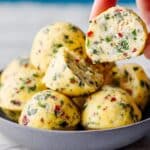 The image shows a gray bowl filled with several yellowish round egg bites speckled with green herbs and red bits, stacked in a small pile. One of the egg bites is held by a woman's hand and is cut in half, revealing a soft, fluffy inside filled with visible layers of green, red, and white pieces evenly mixed throughout. The egg bites have a smooth texture and slight shine on the surface, and the background is a simple white marbled texture with a blurred bright blue area behind. photo taken with an iphone --ar 4:5 --v 7