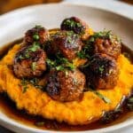 Savor the flavors of tender pork meatballs paired with creamy sweet potato mash and a rich bourbon-maple sauce. This comforting dish balances savory, sweet, and smoky notes, making it perfect for a hearty family dinner.