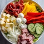 - Assemble the Salad Base: In a large bowl, place the shredded romaine lettuce. Evenly layer the sliced red pepper, mild pepper rings, salami, pepperoni, provolone, mozzarella balls, cucumber slices, white onion strips, and cubed parmesan over the lettuce.