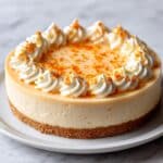 A round, creamy peach-colored cheesecake with a crumbly light brown crust at the bottom, topped with soft white cream swirls evenly placed around the edge, sprinkled with small orange bits on top; the cake is on a white plate, all set on a white marbled surface. Photo taken with an iphone --ar 4:5 --v 7
