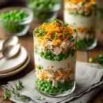 The dish is shown in a clear glass cup with five visible layers. The bottom layer is bright green peas, followed by a thin layer of diced light beige chicken mixed with green peas. Above that is a thick, creamy white layer. Next comes another layer of green peas with more small pieces of chicken, and the top layer is a mix of green peas and shredded orange cheese. The glass cups are placed on a grey cloth over a wooden surface, with a white plate and spoon in the background, surrounded by some green herbs and two glass bowls with more peas and greens. photo taken with an iphone --ar 4:5 --v 7