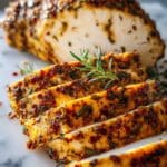A close-up of sliced grilled chicken breast with a golden-brown, spicy herb crust made of red chili flakes and green herbs visible on the surface. The inside of the chicken is white and juicy, with the slices fanned out in the front part of the image and the larger unsliced piece behind. A small green herb sprig rests on top of the chicken. The chicken sits directly on a white marbled textured surface with soft natural lighting highlighting the texture and color. Photo taken with an iphone --ar 4:5 --v 7