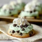 Delight in these Mint Chip Ice Cream Cookies featuring soft, slightly chewy chocolate chip sugar cookies topped with a creamy, minty buttercream frosting studded with mini chocolate chips and finished with a dollop of fresh whipped cream. Perfectly balanced with refreshing peppermint flavor and a hint of green color, these cookies offer a festive treat reminiscent of mint chip ice cream in cookie form.