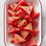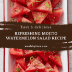 A refreshing Mojito Watermelon salad combining juicy watermelon slices with a tangy lime and olive oil dressing, fresh mint, and a sprinkle of flaky sea salt. Perfect for a light, summery side dish or snack.