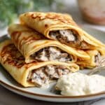 Delicious and savory Mushroom Stuffed Pancakes, also known as Nalysnyky, featuring thin crepe-like pancakes filled with a creamy mushroom and onion mixture. Perfect as a comforting meal or appetizer, these pancakes are tender, flavorful, and enhanced with sour cream for richness.