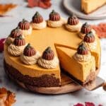 This no-bake vegan pumpkin cheesecake combines creamy, spiced pumpkin filling with a crunchy biscoff cookie crust, topped with velvety biscoff cream and charming pumpkin-shaped truffles. Perfectly set in the fridge, this dessert offers a rich, indulgent texture without any baking required, suitable for vegan and dairy-free diets.