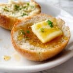 A close-up of a toasted English muffin split in half, placed on a white plate. The bottom half has a golden-brown, slightly crispy surface with a melting, light yellow pat of butter resting on top. Around the butter, there is a thin layer of honey or syrup giving a shiny, sticky texture. Small green bits, likely chopped chives, are scattered lightly over the butter and syrup. The top half of the muffin is toasted to a lighter golden color with a soft, airy texture and also has a few green bits on it. The plate sits on a white marbled surface. photo taken with an iphone --ar 4:5 --v 7