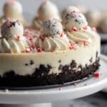 This Peppermint Cheesecake is a festive and creamy dessert perfect for the holiday season. Featuring a crunchy Oreo crust, a smooth peppermint-infused cheesecake filling studded with Andes peppermint crunch chips, and topped with a light peppermint cream cheese frosting, it combines rich textures and refreshing flavors. Baked in a water bath for a silky finish, it is garnished with various peppermint candies to enhance the holiday spirit.