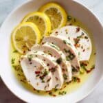 4. Rest and Serve: Transfer the cooked chicken to a cutting board, slice, and serve immediately. Enhance with optional toppings such as cracked black pepper, lemon slices, fresh herbs, or a drizzle of olive oil. If you’re not serving right away, store the chicken whole and covered in the refrigerator for up to 3 to 4 days.